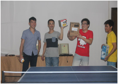 7月18號晚的決賽把整個比賽推向高潮,現場“加油”聲此起彼伏。最終業務部的蔣小華以3:2的比分險勝生產部的蔡偉 畢,奪得比賽冠軍。緊接著公司進行了閉幕式,為比賽的獲獎者頒發實物獎品,并拍照留念。