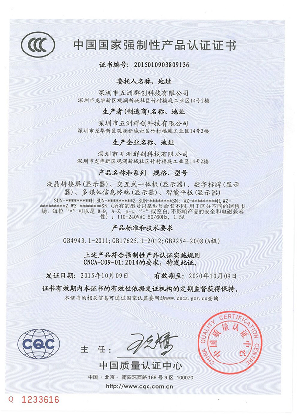 2015年10月9日五洲群創產品通過中國國家強制性產品認證證書并正式發證!