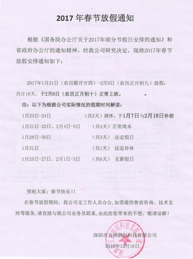 為方便大家的工作安排,現將我司2017年春節放假安排如下: