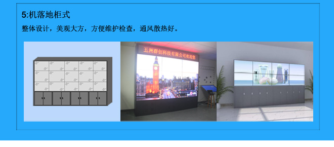 1:內置拼接技術。2:支持隨機數生成地址碼,調屏更方便。3:自動智能溫控系統,4:標準機柜安裝結構,標準化、模塊化可實現快速拼接安裝。5:鈑金外殼,工業級零部件,散熱更換,堅固耐用,使用壽命長達80000小時。6:自動開關機管理功能,內置時鐘設置,自定義設置自動開關機時間7:色彩自動調節,精準采集畫面數據,保證拼接屏色彩亮度輸出一致。8:支持畫面校正功能,支持拼接畫面錯位補償功能。9:低功耗長壽命支持7*24小時開機。10:超級好屏,雙向180度全視角,無視差,滿足全方位舒適觀賞。11:包裝給力,運輸安全,結實抗摔抗壓,承重大。12:隨心無縫拼接,無論多大空間顯示,五洲視界拼接屏都能無縫鏈接展現完美商業顯示方案。13:圖像180度旋轉功能。