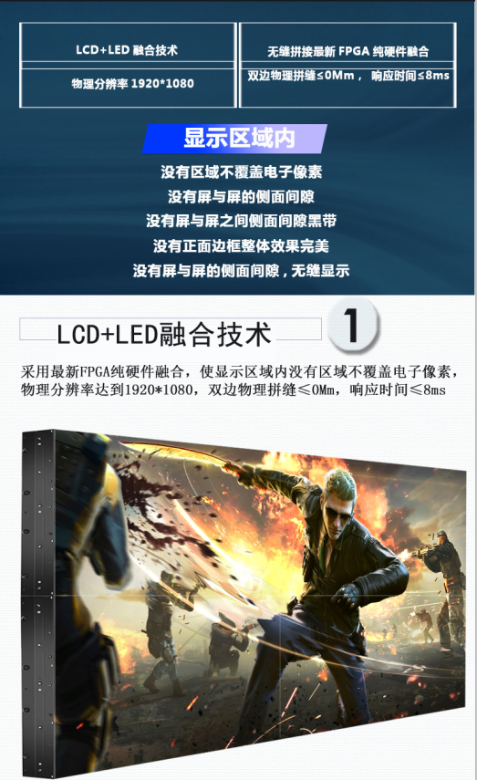 ◆49英寸拼接單元所采用使用LCD+LED融合技術,采用最新FPGA純硬件融合,使顯示區域內沒有區域不覆蓋電子像素