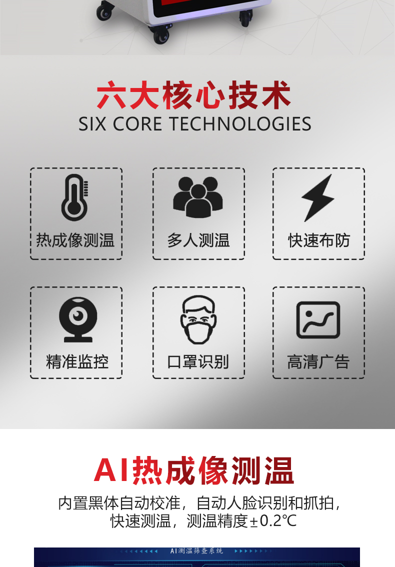 進口紅外熱成像測溫元件,內置專利黑體實時溫度校準技術,系統具備自動人臉識別和抓拍,快速毫秒級檢測額頭熱感溫度,熱感測溫精確度為醫用級±0.2℃,精確顯示最高溫度值,快速找出體溫超標人員并對其進行紅色標記,實時傳輸給管理中心。