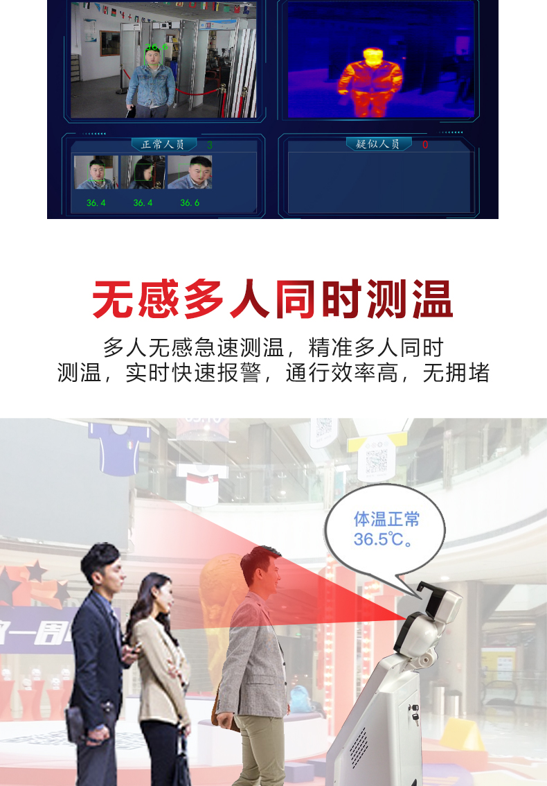 可以同時監測大范圍人群的多人體溫,并用專業優化算法的人臉識別系統,使人臉在口罩遮擋情況下也能精準多人同時測溫,實時快速報警,系統測溫快、精度高、多人并發、通行效率高、無擁堵。