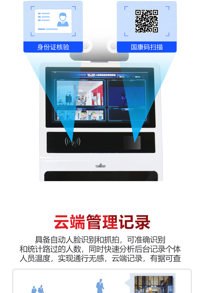 具備自動人臉識別和抓拍,可準確識別和統計路過的人數,同時快速分析后臺記錄個體人員溫度,實現通行無感,云端記錄,有據可查。