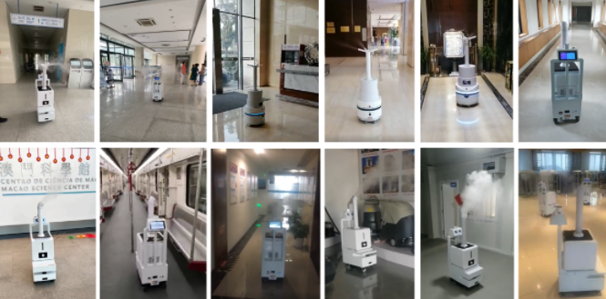 霧化消毒機器人,以機器人為載體,自主移動式多點自主消毒。通過稀釋消毒液并進行霧化,消毒液經過霧化后形成微小的顆粒,有效抑制附著在物體表面上的微生物、細菌、病毒,按照實際消毒需求,自主規劃消毒路線,全自動室內無人駕駛,可對室內空間物表和空氣進行360°無死角消毒,15分鐘可消毒1000m3空間,減少人工接觸,避免人員感染風險。