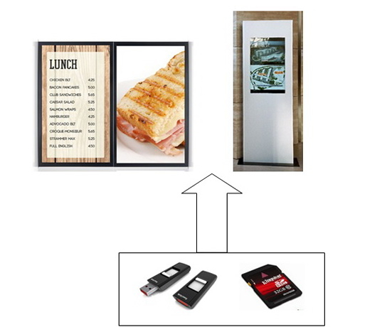 拷貝制作好的節(jié)目到U盤, 插入USB接口, 廣告機自動播放節(jié)目列表. 可以設置轉(zhuǎn)場模式等個性化模式.