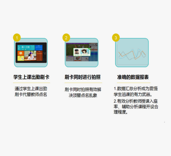 系統角色劃分精準有效,管理者可流暢的設定考勤規則,直觀明確的定義人員權限,在后臺軟件設置完畢后,師生上課前在班級門外的智慧班牌上刷卡,刷卡的同時設備自動拍照,后臺軟件實時形成統計報表,智慧班牌上同步計算、展示人員出勤情況。